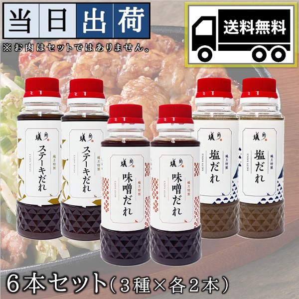 たっぷりのにんにくにコチュジャンを加え、辛味の中に旨みとコクの効いた「味噌だれ」、にんにく、ゴマ油で風味豊かにし、アクセントに黒胡椒、レモン汁を加え、あっさりと仕上げた「塩だれ」、九州特有の甘めの醤油に酸味を加え、さっぱりとした飽きのこない味の「ステーキだれ」の3種×各2本ずつを1セットにまとめてご用意いたしました。